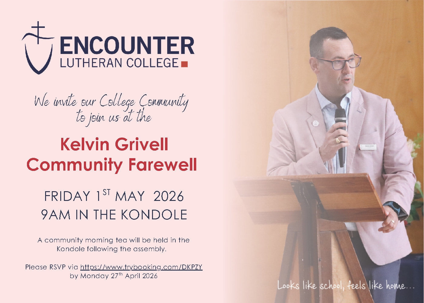 We warmly invite our community to come together as we farewell Mr Kelvin Grivell and give thanks for his 14 years of dedicated and faithful service as Principal of Encounter Lutheran College.